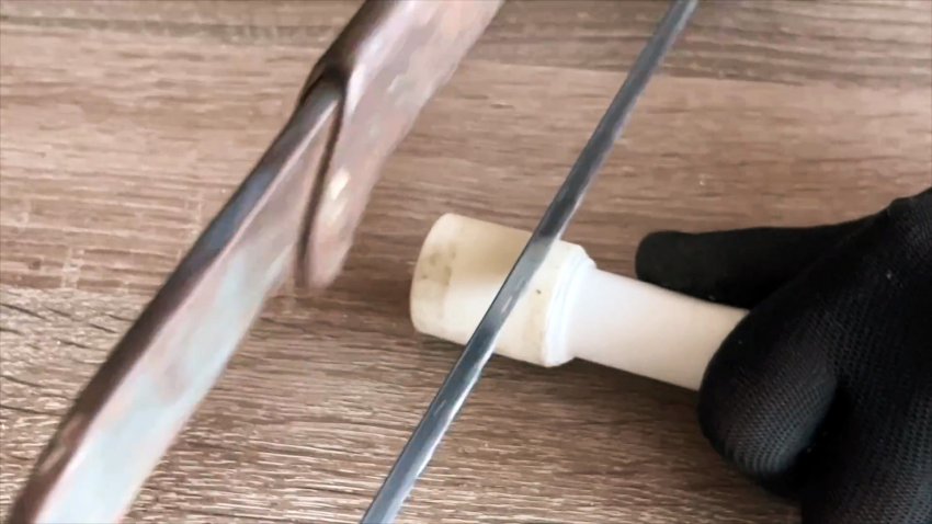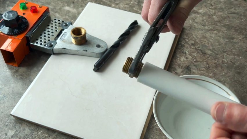 После разогрева фитингов формируем внутреннюю резьбу в трубе большего диаметра, разметив в ней массивное сверло для теплоотвода. Концом трубы обхватываем латунный фитинг с наружной резьбой и давим на трубу, чтобы она уперлась торцом в гаечный буртик.