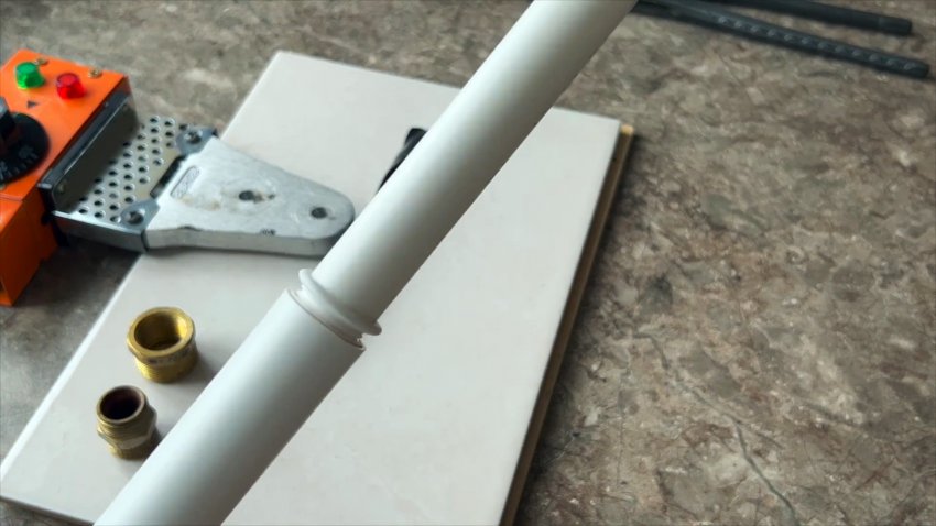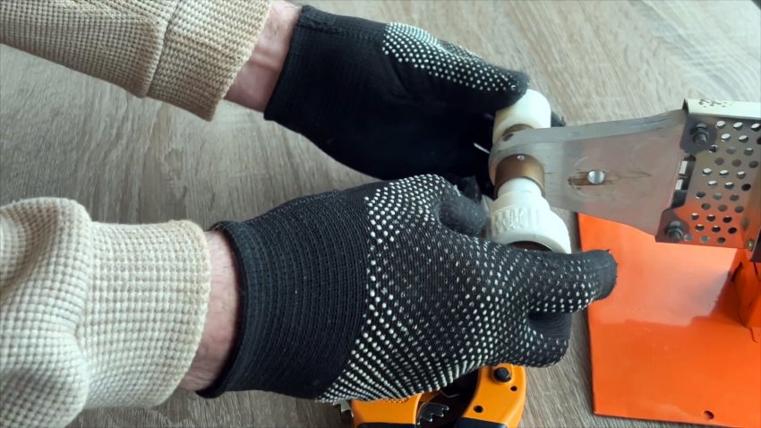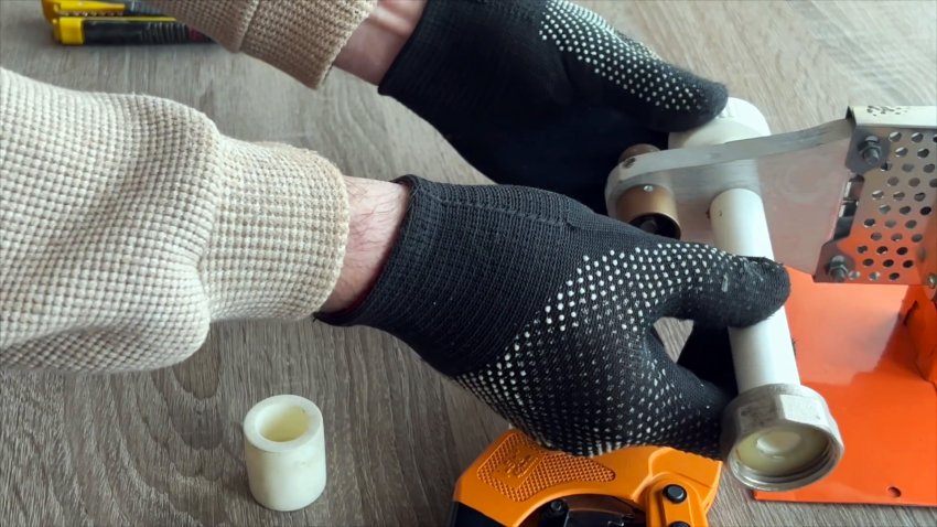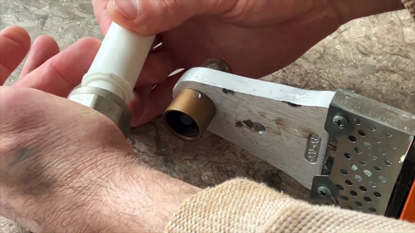 Одновременно нагреваем конец сгона и трубы на аппарате для сварки пластиковых труб и вдавливаем сгон внутрь трубы.