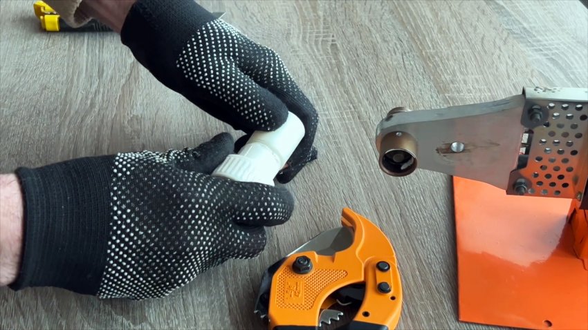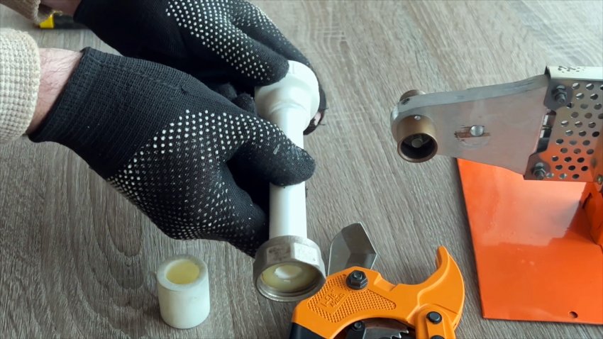 Выдерживаем некоторое время трубу в таком положении и быстро охлаждаем фитинг и конец трубы в емкости с водой.