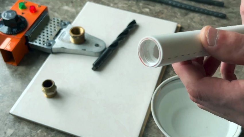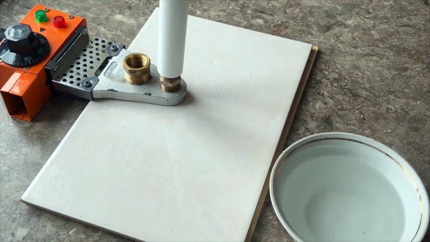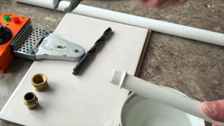 Для резьбового соединения двух пластиковых труб разного диаметра нужно в большей по диаметру трубе нарезать внутреннюю, а в меньшей – наружную резьбу. С этой целью устанавливаем на нагревательный элемент аппарата для сварки пластиковых труб латунные фитинги с наружной и внутренней резьбой, а рядом ставим емкость с водой.