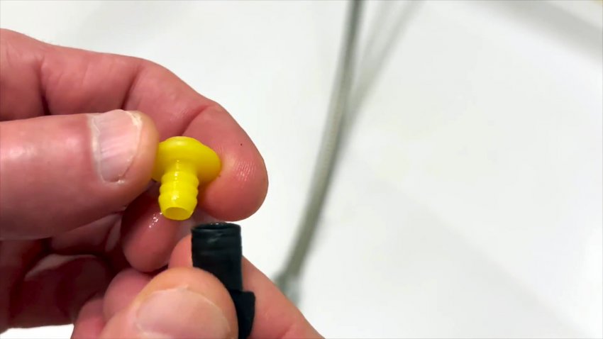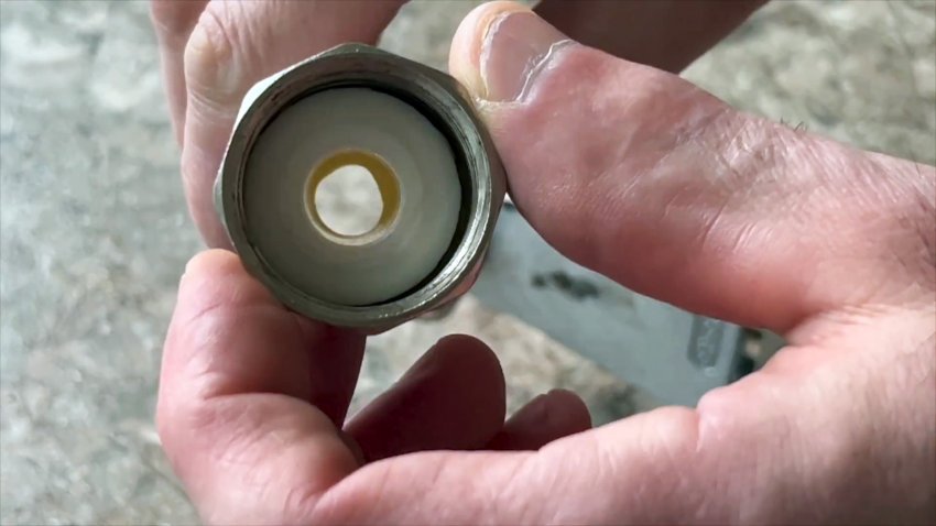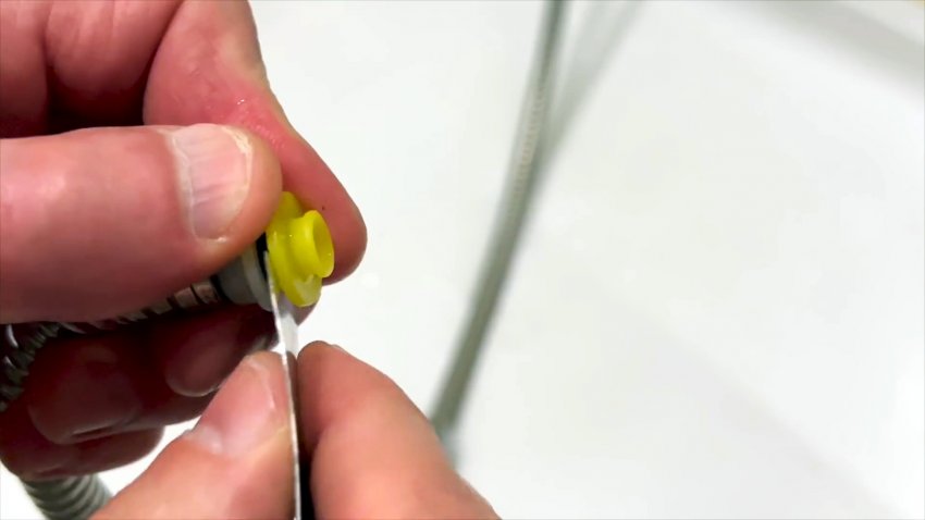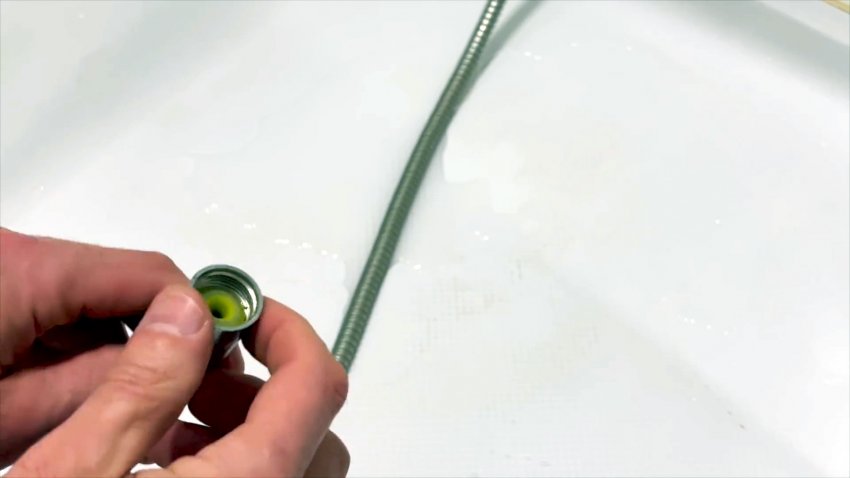Откручиваем накидную гайку, соединяющую шланг с лейкой. Удаляем прокладку и лезвием ножа выпрессовываем внутреннюю втулку с насаженной на нее резиновой трубкой из наружной.