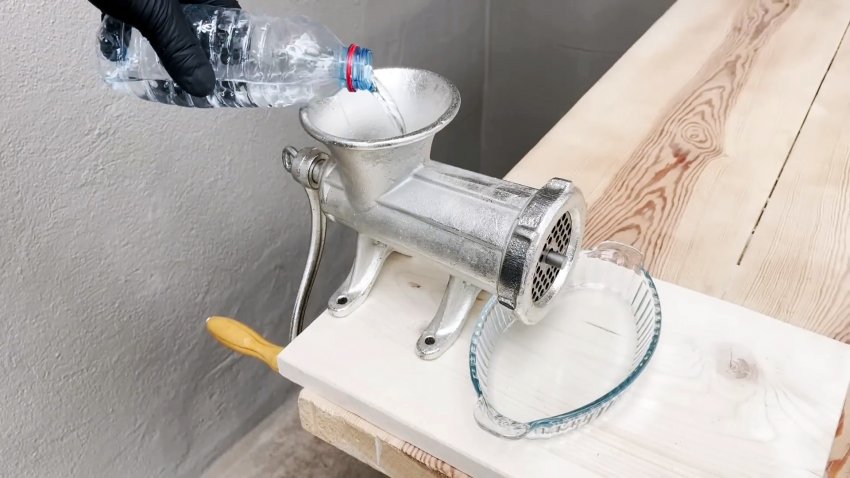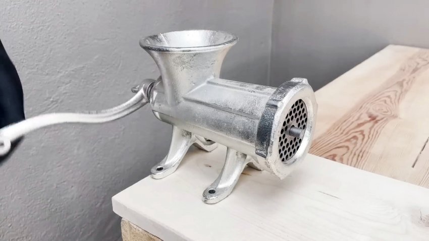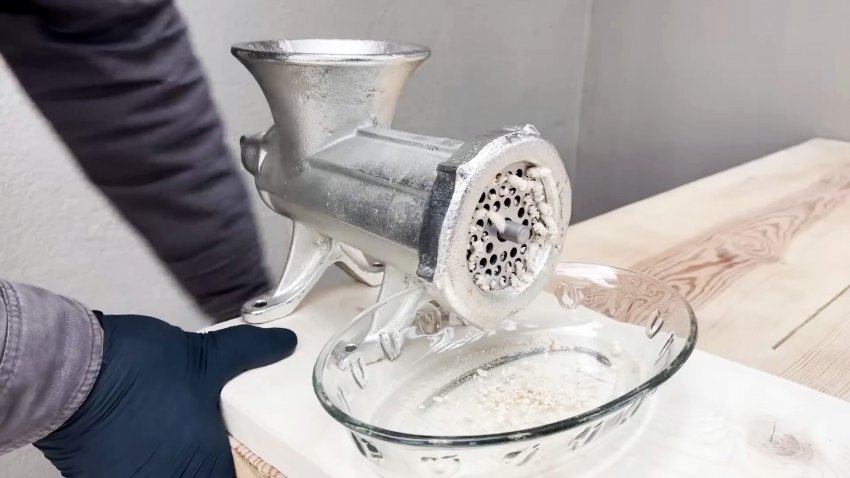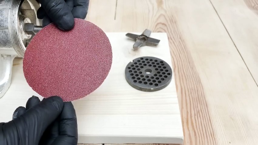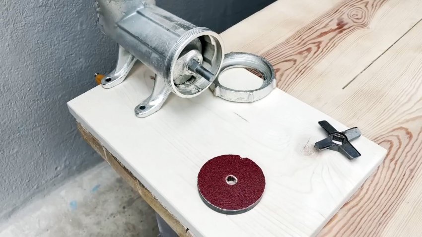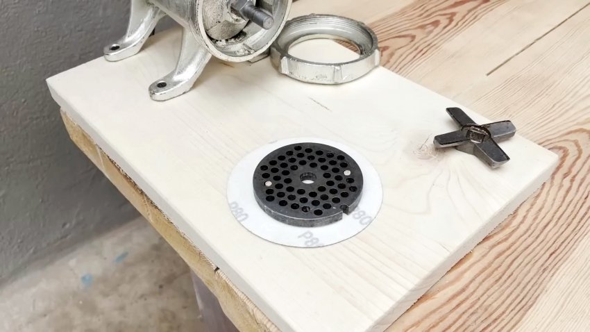 Ставим на место нож, решетку с наждачкой и стопорами, затягиваем прижимную гайку и вращаем ручку мясорубки.