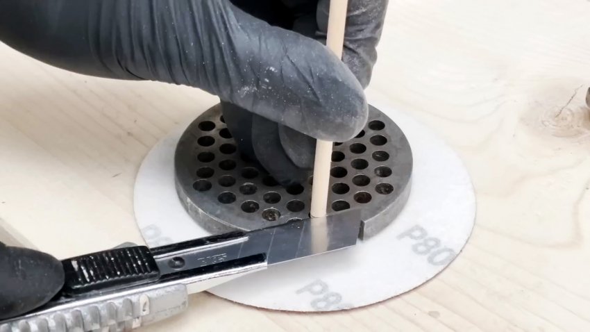 Вырезаем из листа наждачной бумаги зернистостью Р80 круг чуть больше диаметра решетки, которую укладываем на обратную сторону наждачки. Вставляем в одно из отверстий деревянный стержень и отрезаем 2 фрагмента по высоте равные толщине сетки.