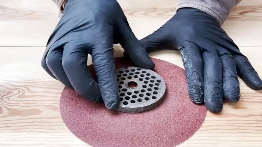 Решетку затачиваем на наждачной бумаге, совершая вращательные движения. Для обеспечения «мокрой» заточки в отверстие в центре решетки наливаем немного воды, не прекращая процесса заточки.