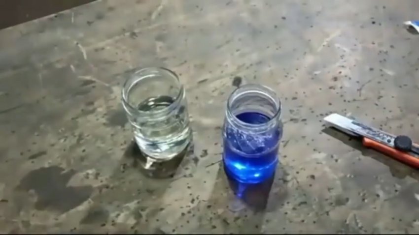 Добавляем к медному купоросу 50 мл технического или медицинского спирта C2H5O. Содержимое второй банки представляет аккумуляторный электролит в количестве 250 мл, который вливаем в банку с раствором медного купороса и спирта.