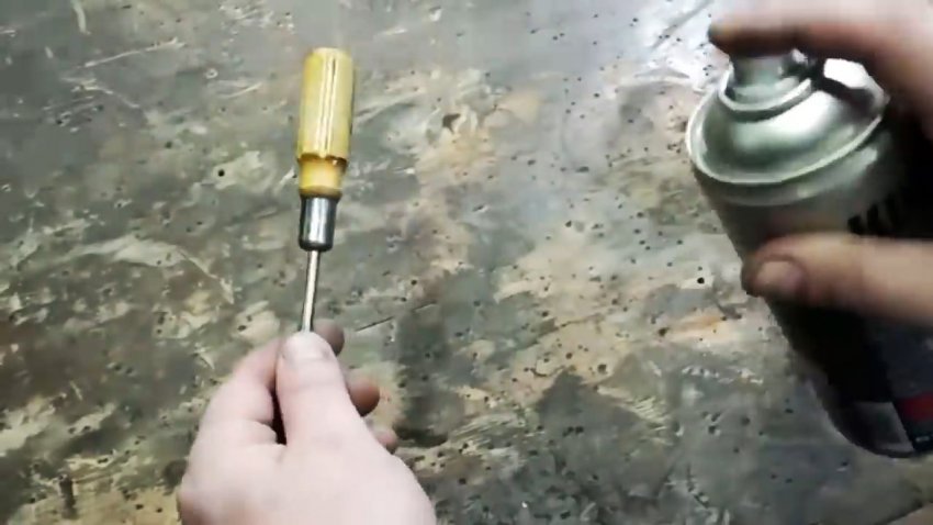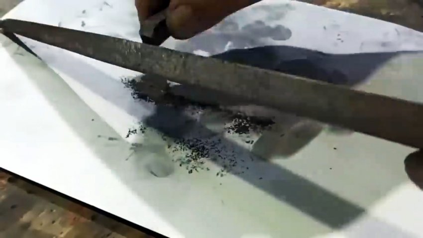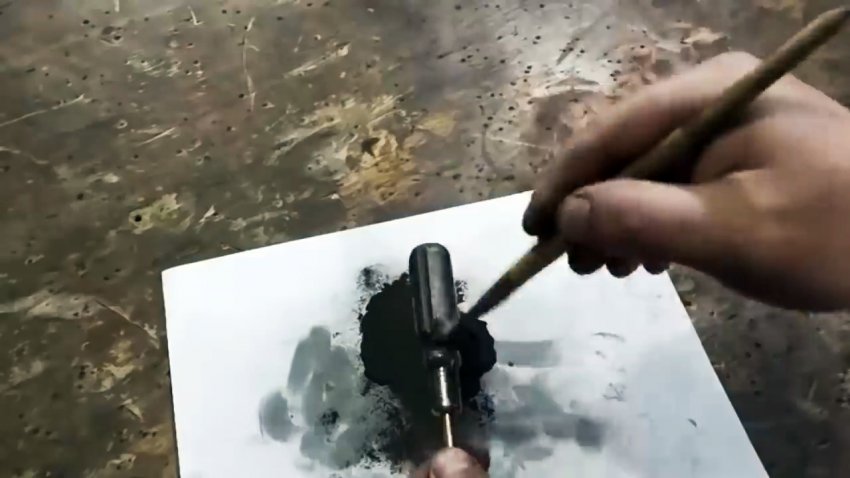 Далее наносим акриловый лак на неметаллическую поверхность. С помощью опиливания напильником графитовой щетки электродвигателя получаем порошок.