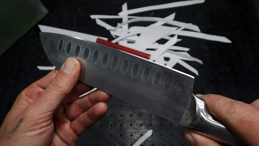 Проверяем степень заточки, повторяя резку листа бумаги на весу. Это получается очень просто и легко. Таким способом с помощью точильного камня, куска трубы, строительной терки и пасты ГОИ можно затачивать как новые, так и старые ножи. Результат всегда будет положительным.
