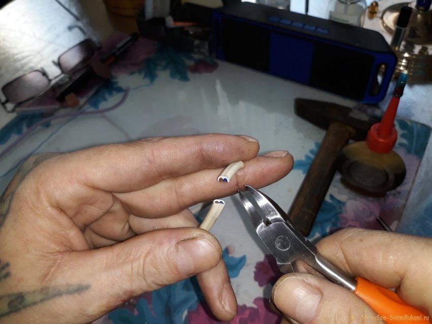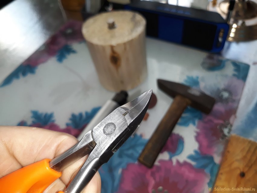 Для этого нужно расширить разболтавшуюся со временем втулку, соединяющую две половины инструмента. Расширять втулку мы будем путем ее вертикального легкого расплющивания. В качестве наковаленки можно использовать второй молоток, топорик, или просто вбитый в отрезок полена небольшой металлический штырь с плоским торцом. Итак, кладем кусачки на наковаленку, втулкой на самое выпуклое место, и сверху по втулке наносим молоточком несильные удары.