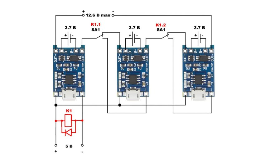 Иными словами, во время использования все АКБ включены последовательно, через модуль TP4056. Как только подключается зарядка, реле срабатывает и разъединяет последовательность включения АКБ и соединяет все входа модулей воедино для питания.