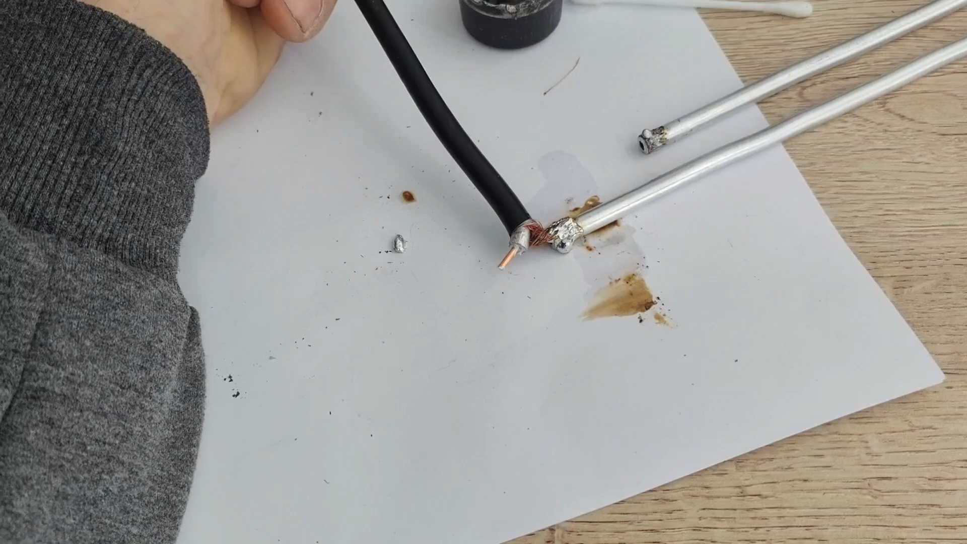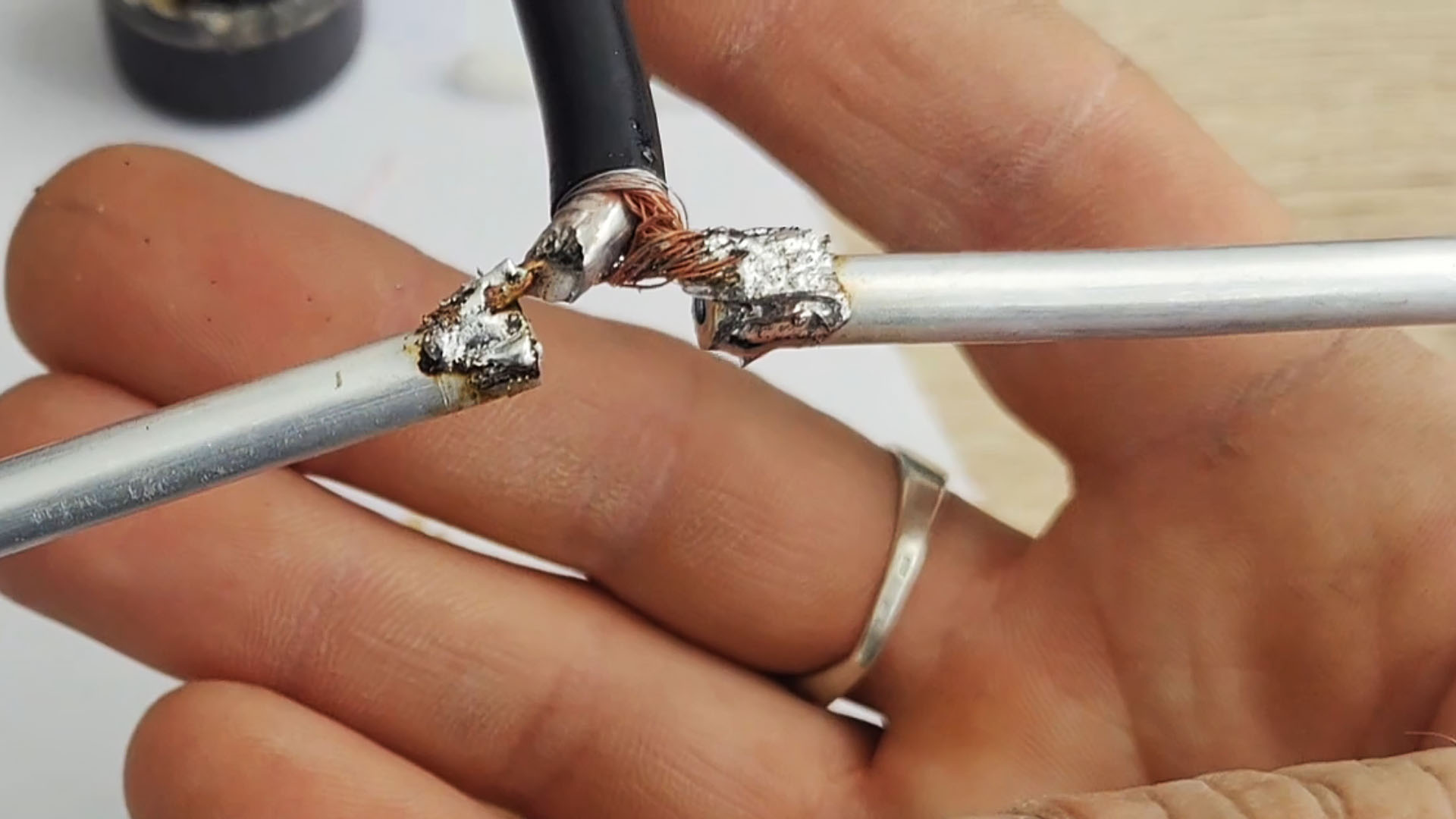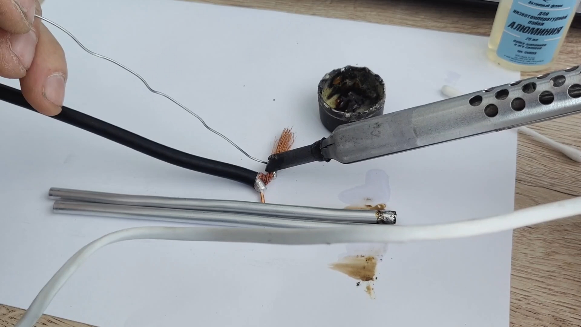 В данном примере покрывалась алюминиевая оплетка кабеля, которая теперь очень легко паяется обычной канифолью с припоем.
