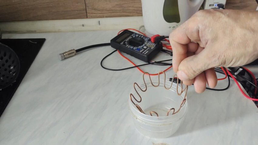 Первым делом необходимо сделать спираль из одножильного медного провода длиной примерно 0,5 метра. И поместить ее в емкость.