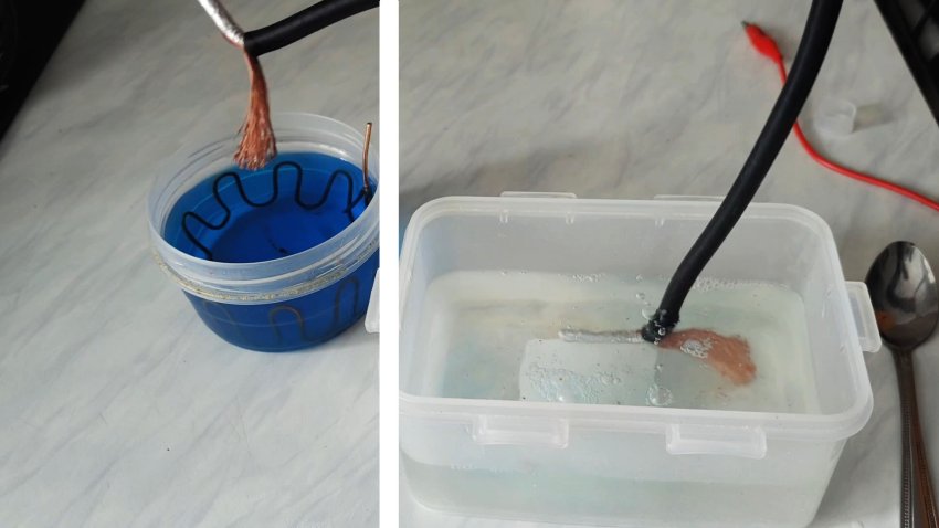 Наливаем раствор в емкость. Плюсовой вывод от блока подключаем к медной проволоке. Минусовой вывод подключаем к металлу, который необходимо покрыть медью. Опускаем его в раствор.