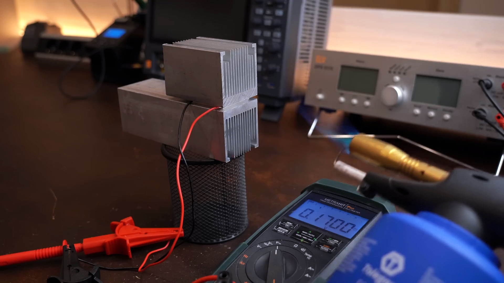 Я хотел провести тесты, подавая одинаковую постоянную температуру на горячую и холодную стороны, измеряя напряжение холостого хода и ток короткого замыкания. Но поддерживать постоянную температуру горячей стороны оказалось сложно, поэтому я решил поддерживать теплую сторону при комнатной температуре с помощью кулера для процессора.