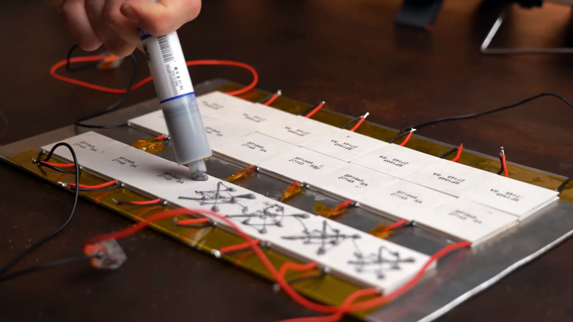 Затем я нанесу термопасту на модули и размещу 21 из них на алюминиевом слое. Я укорочу и соединю провода модулей последовательно, используя каптоновую ленту для предотвращения короткого замыкания.