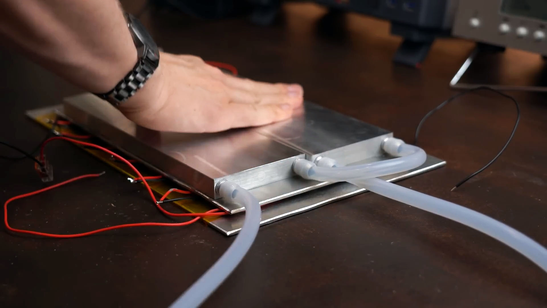 Я прикреплю меньший кусок алюминия к холодной стороне с помощью термопасты. Проверка показала, что система работает: выходное напряжение позволяет питать светодиод. Для улучшения охлаждения я развернул два алюминиевых блока для водяного охлаждения, добавив термопасту и соединив их трубками.