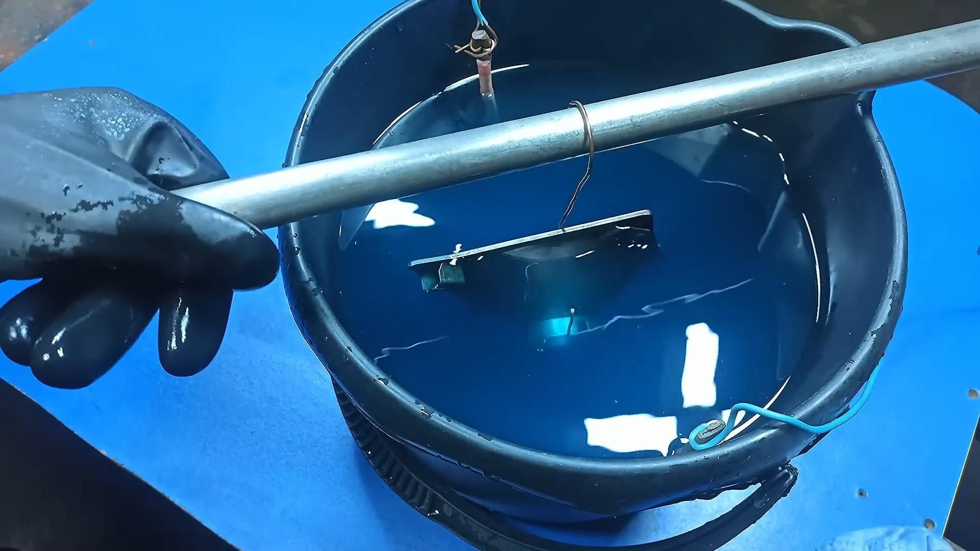 Сначала перейдем к подготовке медного электролита. Смешаем дистиллированную воду и аккумуляторный электролит. Опустим в раствор медные электроны.