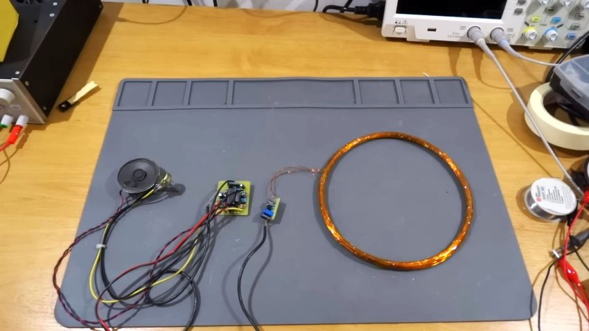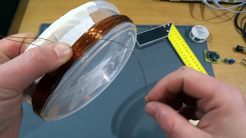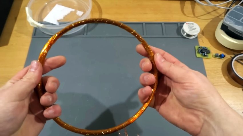 Катушка намотана на круглую оправу диаметром 17 см, но можно выбрать и другой размер. Провод для катушки должен быть от 0,2 до 0,5 мм, чтобы она была удобной в использовании.