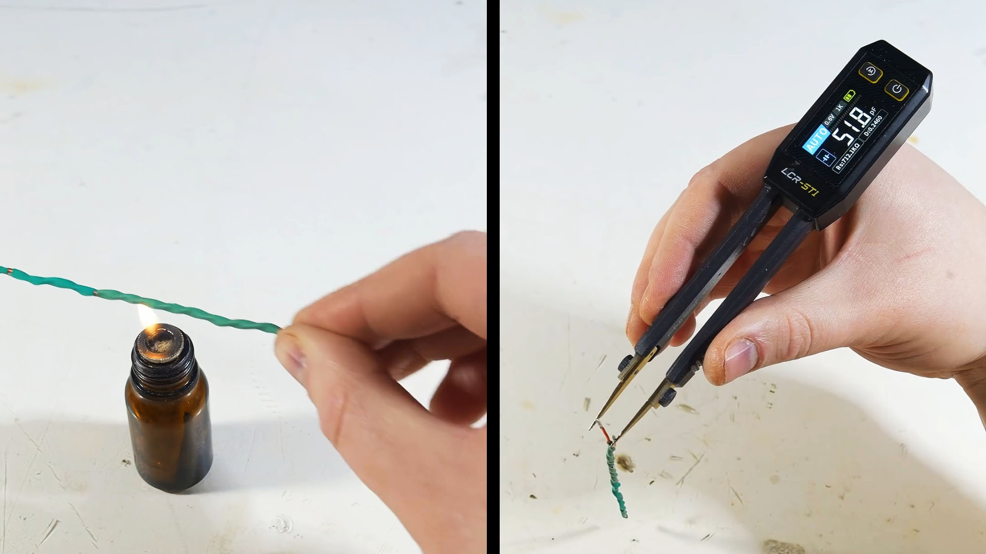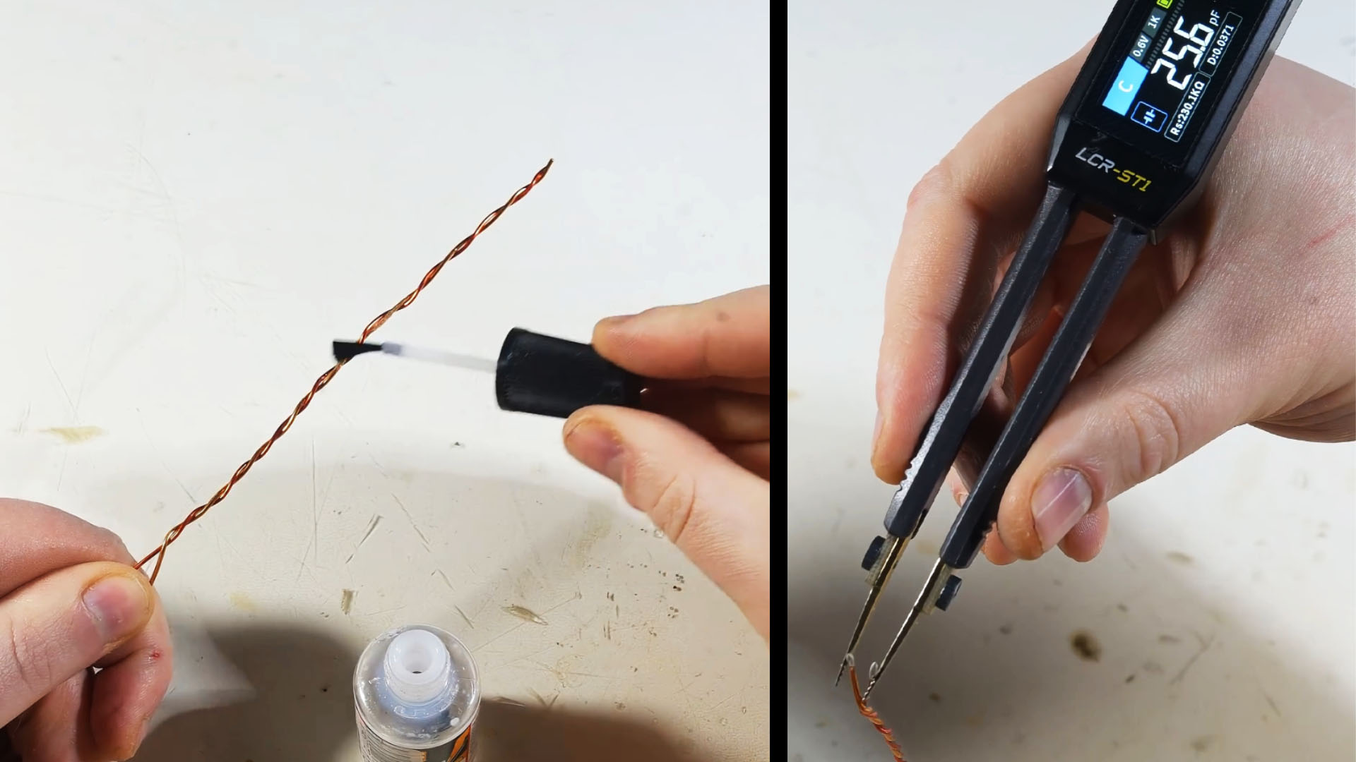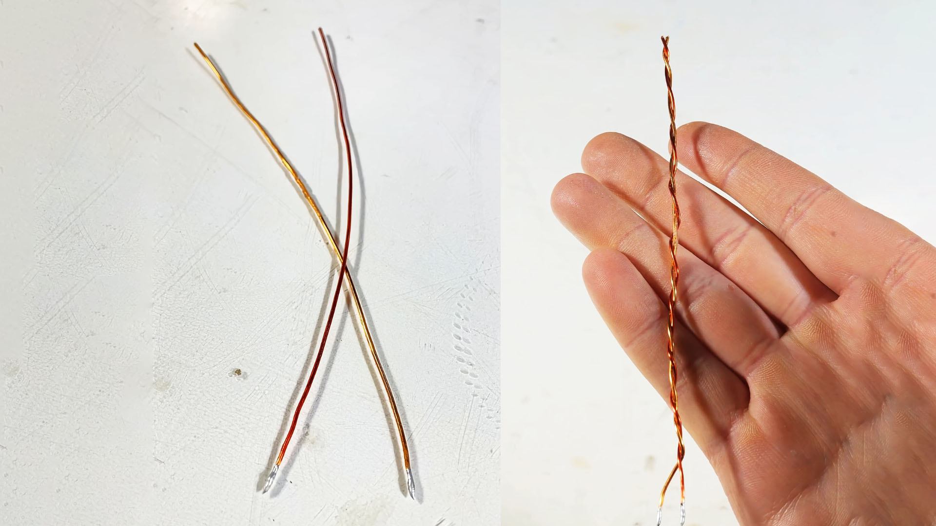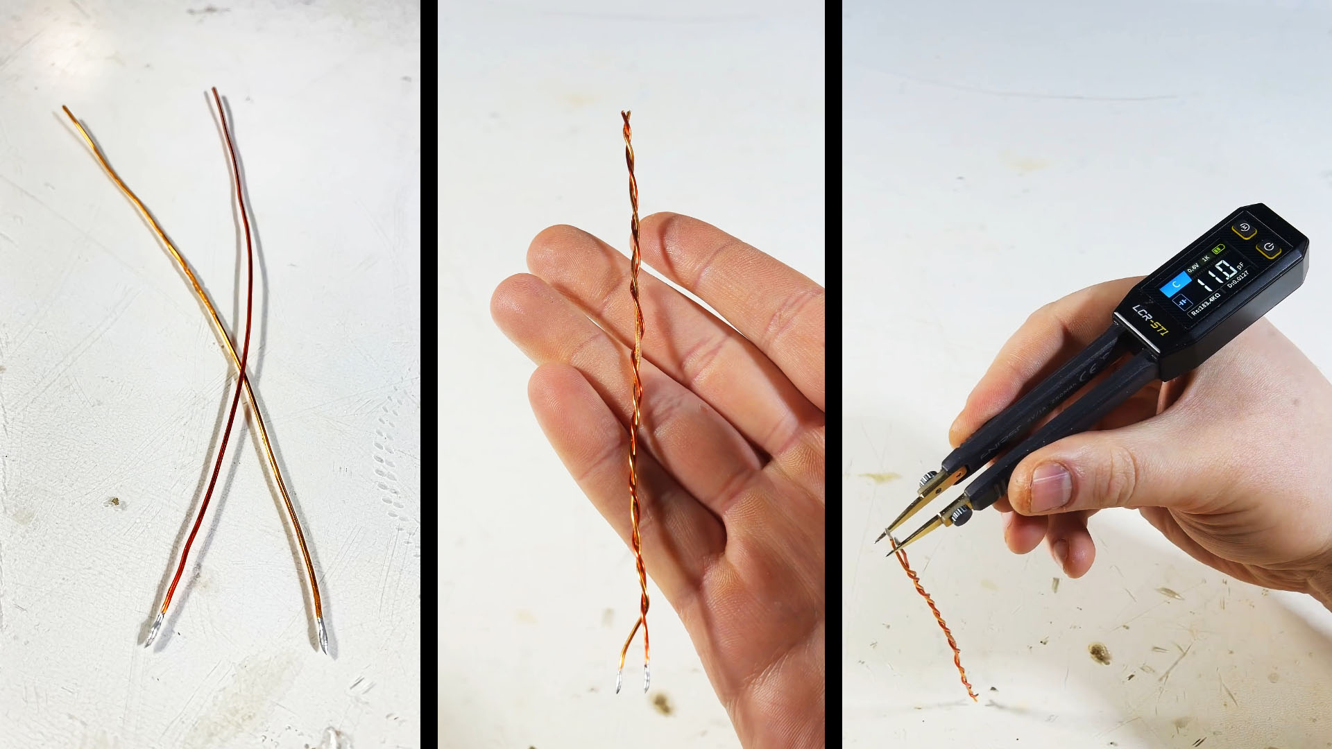 Для создания простого конденсатора я взял два кусочка медных провода в лаковой изоляции и скрутил их между собой, чтобы они были друг к другу хорошо прижаты. Медные проводники будут обкладками конденсатора, а лаковая изоляция — слоем диэлектрика. Ёмкость такого конденсатора — 11 пФ.