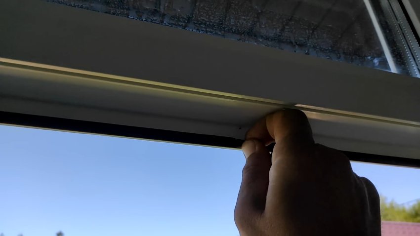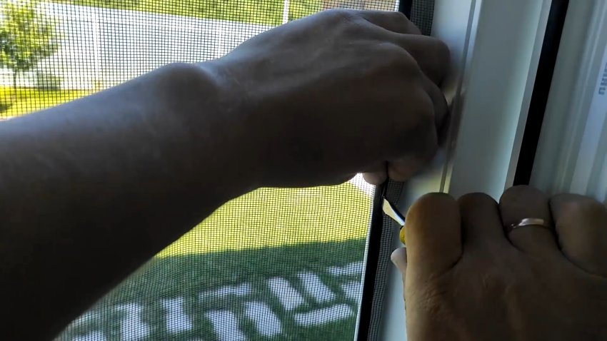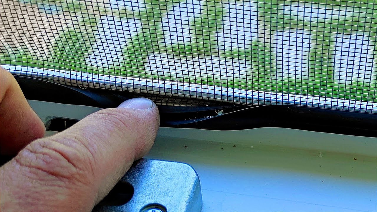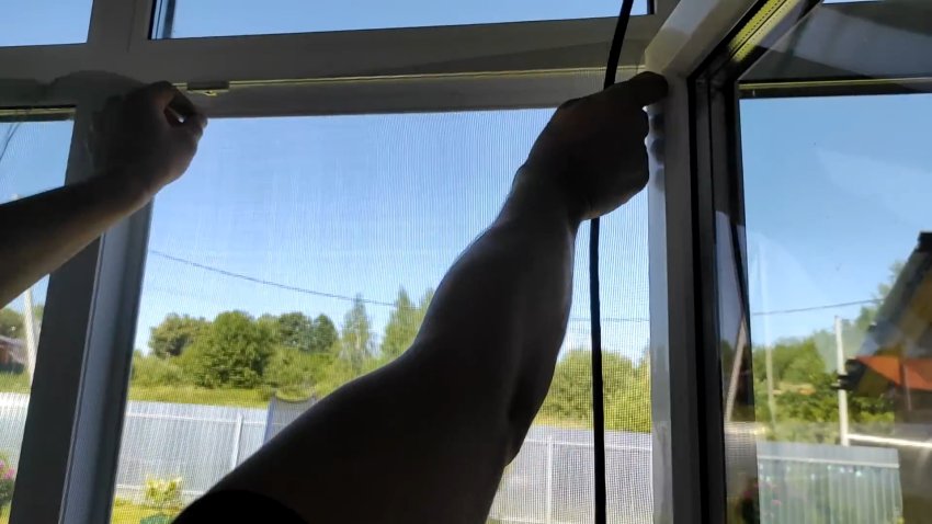 Теперь можно просто утопить резинку руками. В некоторых местах может понадобиться подправить её с помощью той же карточки или плоской отвертки. Резинка должна быть правильно утоплена с этой стороны. Вот так отжимаем её немного, и она хорошо вставляется и поджимает сетку.