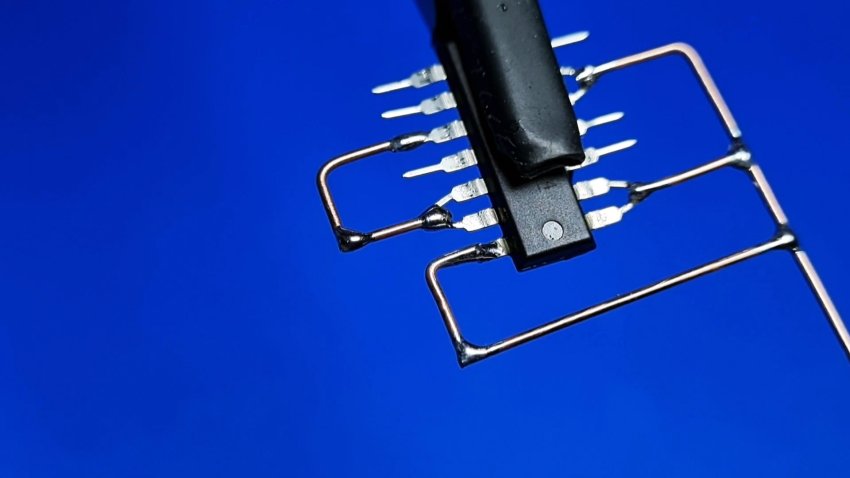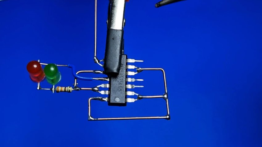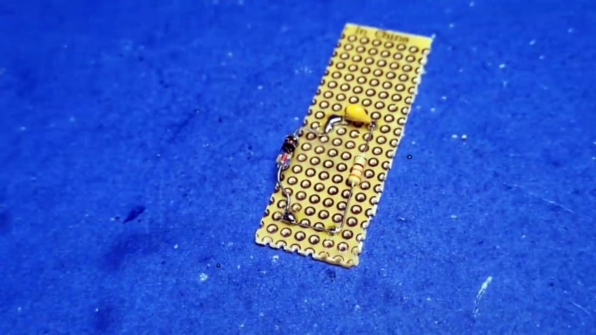 Далее припаиваются светодиоды включенные встречно-паралельно, резистор и колодка питания с антенной, в роли которой идет кусок провода.