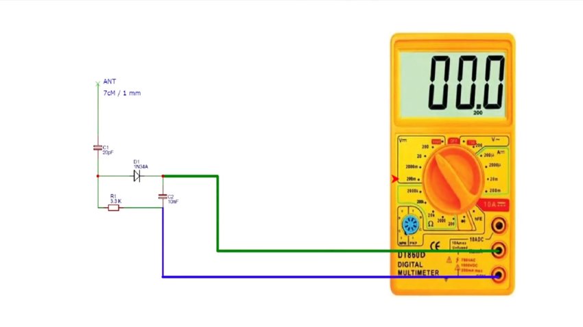 Детектор несущего радиосигнала не нуждается в питании и выполнен в виде приставки к мультиметру.