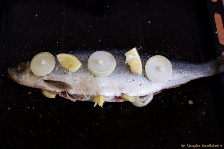 3. Выкладываем на противень дольки лимона и лука. Кладём сверху тушку. Дольки лимона защитят нижнюю часть сельди от чрезмерного воздействия температур. Таким образом, наша рыбка запечётся со всех сторон равномерно.