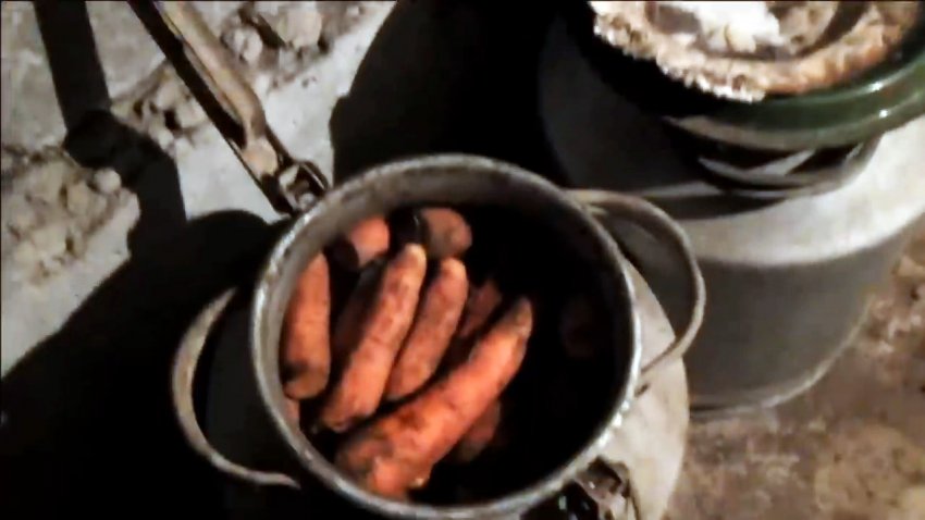 Но это не все хитрости! Посмотрите на морковь в первой фляге. У неё за несколько месяцев хранения выросла ботва около полуметра длиной. А морковь во второй и третьей фляге заметно отличается. Ботвы нет совсем.