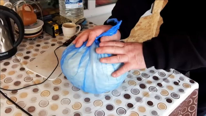 Как же готовится капуста к длительному хранению? Следует взять полиэтиленовый пакет необходимого размера. И даже с запасом. Лучше использовать полиэтилен немного пожестче. Укладываем в него вилок. Заправляем в пакет трубу пылесоса, обхватываем плотно рукой. Включаем пылесос. Пакет чуть приподнимаем, закручиваем его у трубы пылесоса. Завязываем его веревочкой как воздушный шарик. А потом еще дополнительно сам верх пакета узлом. Вот и вся упаковка. Затем он помещается в сетку и подвешивается в подвале.