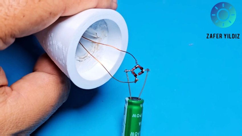Собираем диодный мост и соединяем с выходом катушки и ионистором, соблюдая полярность.