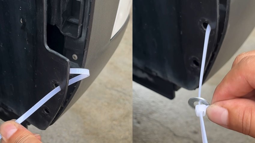 В примере ниже будем крепить подкрылки к бамперу. Продеваем стяжку в шайбу, затем продеваем хвостик в отверстие крепления.