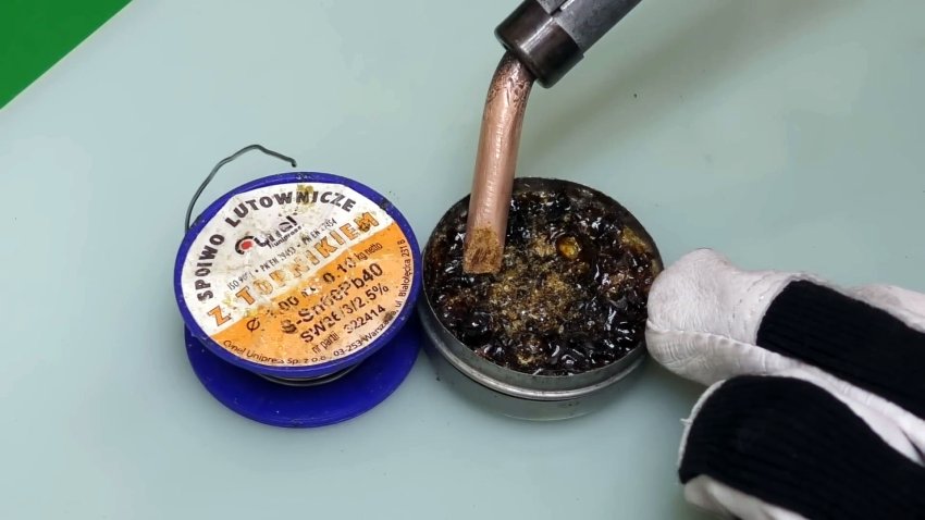 Приставьте холодный паяльник к канифоли и дождитесь, когда она начнет плавиться. Температура размягчения канифоли ниже той, при которой медь окисляется. Ваша задача — покрыть канифолью рабочую часть жала, пока паяльник не прогрелся. Это защитит металл от окисления.