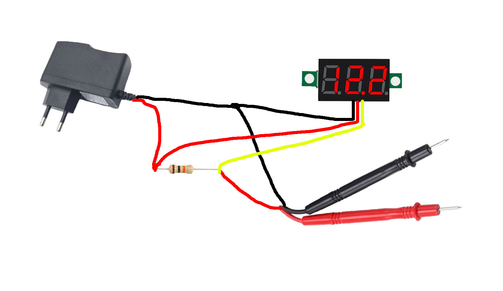 Припаиваем к плате. Черные вывода - к минусу платы. Резистор с выводом от вольтметра - к плюсу. Блок схема: