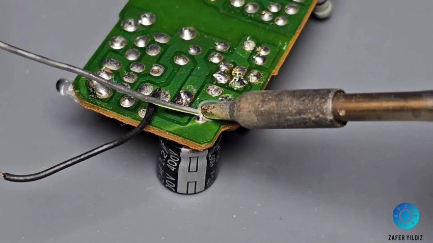 Впаиваем конденсатор на 2,2 мкФ 400 В соблюдая полярность, взамен прошлого конденсатора.