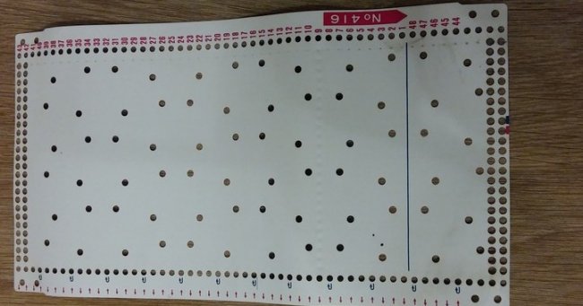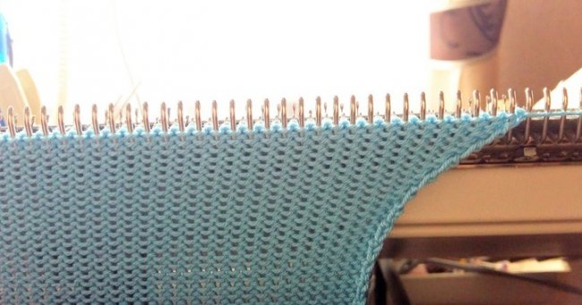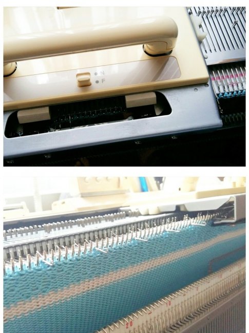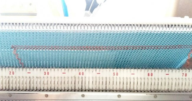 Нам понадобятся: вязальная машина (перфокарточная Бразер), 2,5 мотка голубой нитки и немного белой для отделки.