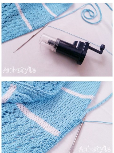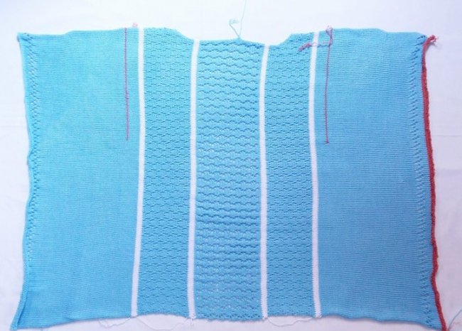 83 ряд — провязать с правой стороны 65 петель контрастной ниткой. Это будет наша пройма. Далее 10 рядов голубым цветом.