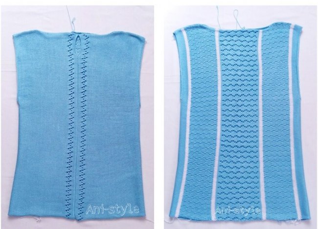 Вяжем 35 рядов. Можете сделать ажурные дорожки, чтобы облагородить немного шов на спинке.