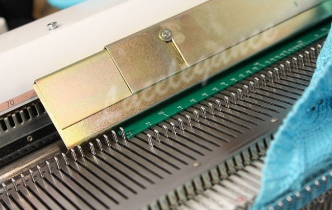 Теперь возьмите линейку от вязальной машины и положите ее на заднюю фонтуру между рельсом и рабочими иглами слева от себя (рельс закрыт, чтобы масло не попало на полочку).