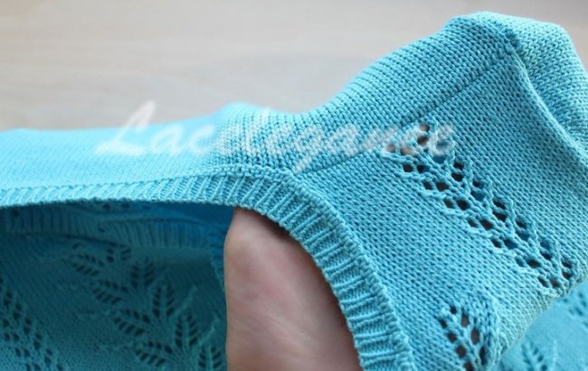 Если хотите сделать пошире полосу лицевой глади между резинкой и полочкой, то провяжите еще 2-3 круговых ряда. У белого и лаймового кардигана связаны по 4 круговых ряда, у голубого — только один.