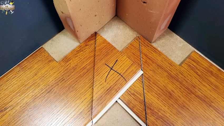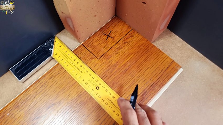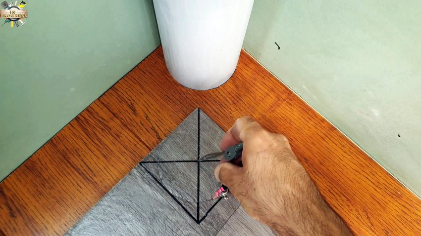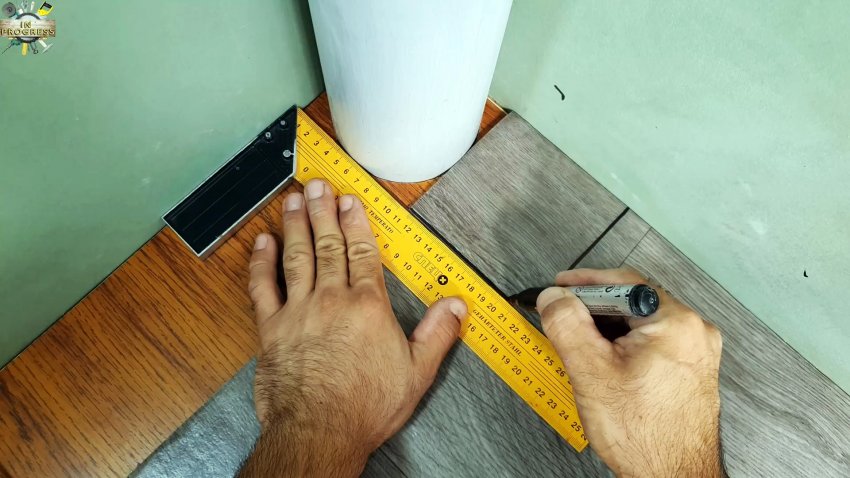 И первый случай – толстая канализационная труба в углу помещения. Как подрезать линолеум правильно в этом случае. Всё просто. Для разметки понадобится угольник и маркер. При помощи угольника проводим линию перпендикулярно одной стене. Затем повторяем действия со второй.