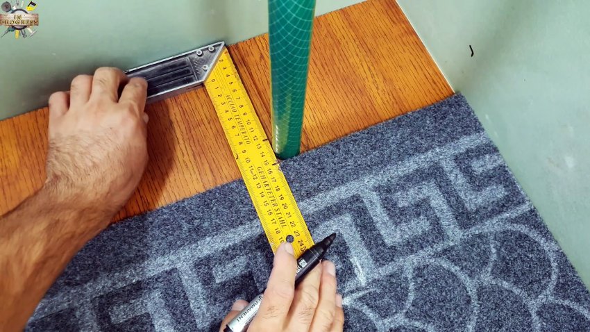 Второй случай сложнее. Труба расположена не в углу, а на расстоянии от стены. И здесь будем действовать хитрее. Отметку сначала делаем не на покрытии, а на угольнике. Отмечаем на нём диаметр трубы на расстоянии от стены. А затем переносим эти метки на ковролин, но уже не маркером, а мелом. Повторяем разметку от другой стены. Получаем на покрытии размеченный квадрат.