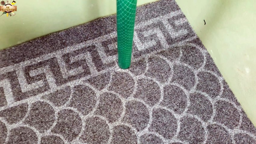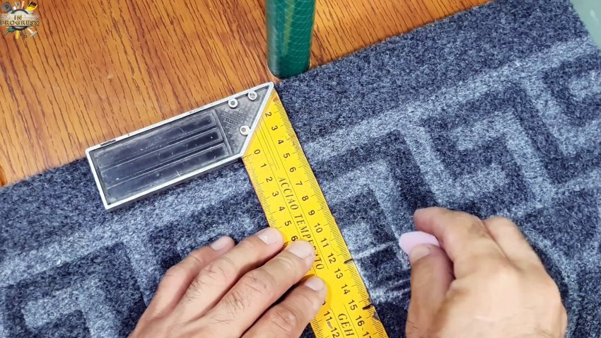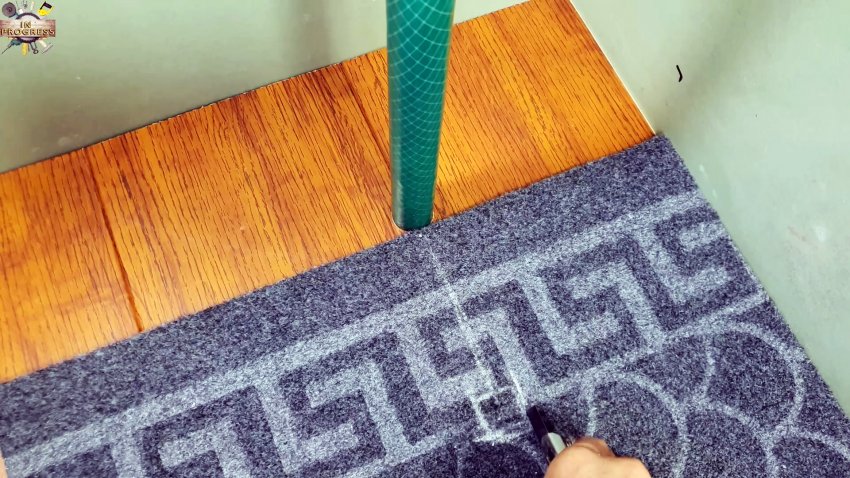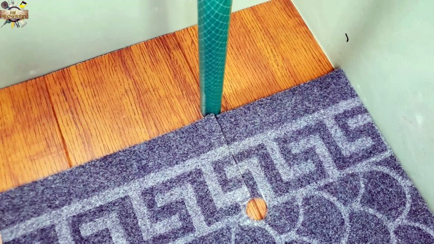 По стороне квадрата сверлится или вырезается отверстие. Удобно это делать корончатым сверлом по дереву необходимого диаметра. Само ковровое покрытие тоже придется разрезать.