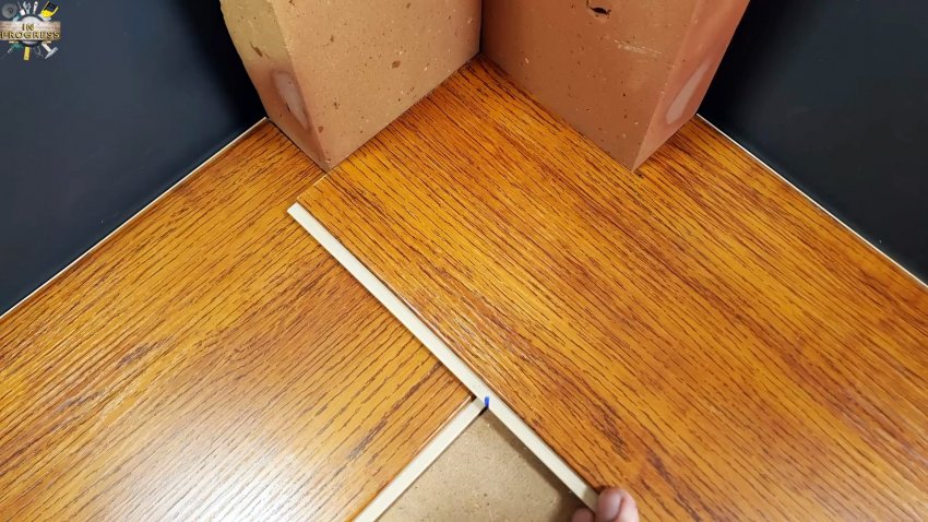 А сейчас будем прирезать материал покрытия не к трубам, а к прямоугольным выступам в углу помещения. Пожалуй, это даже проще. Главное, верно разметить. При помощи уже ставшего нам родным угольника.