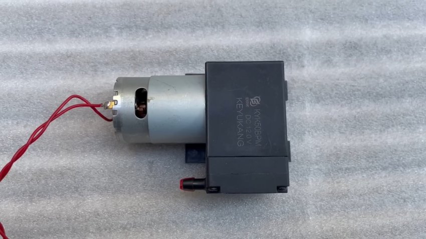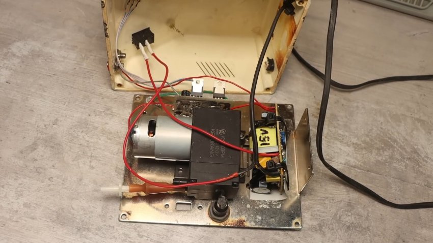 В основе прибора использован старый блок питания в пластиковом корпусе. На лицевой панели расположены переменный резистор, сетевая кнопка, разъём – всё, что необходимо. Ещё был использован китайский компрессор на 12 Вольт с двумя отверстиями для всасывания и выхода воздуха.