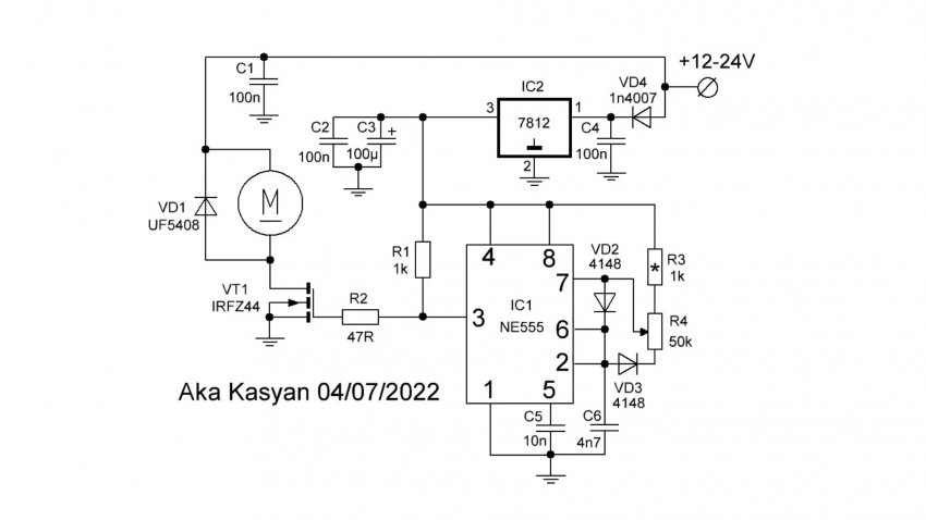 Регулятором оборотов будет служить самодельный ШИМ-регулятор на базе таймера 555, который управляет мощным полевым транзистором. Эта схема не напрягаясь работает с токами до 10 Ампер, т.е. с большим запасом.