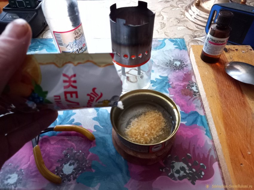 При помощи плоскогубцев или салфетки, снимаем горячую емкость с кипящей водой, и сразу высыпаем туда 10 гр. желатина.