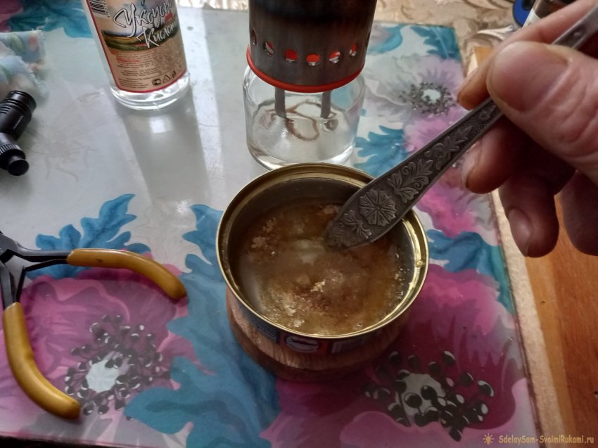 В подготовленную металлическую емкость (я взял вымытую консервную банку) вливаем три столовые ложки обычной воды.