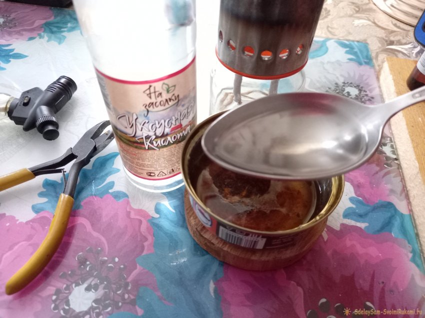 Смесь должна получиться по консистенции похожей на кисель. На специфически пахучий кисель! Запашок стоит тот еще, от горячего желатина, а сейчас еще в ход пойдет и уксус, так что неплохо бы и форточку приоткрыть, пока не закончим работу, и не перельем клей в герметичную емкость. Но качества клея стоят того, чтобы потерпеть пару минут эти неудобства. Итак, желатин растворился, теперь добавляем одну столовую ложку уксуса 70-процентного.
