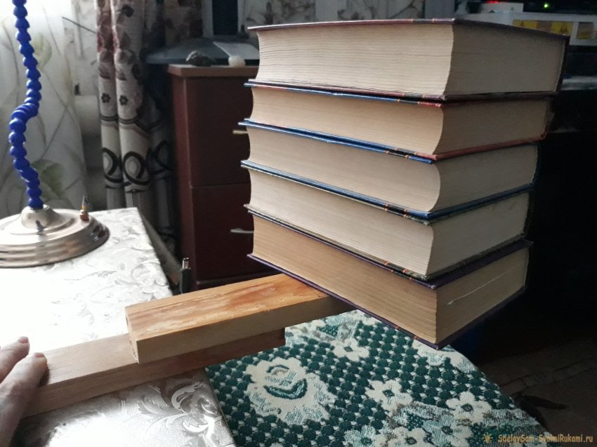 Лучше, конечно, использовать специальные струбцины, но за их неимением сойдет и что-нибудь тяжелое, типа стопки толстых книг. Оставляем склеиваемые дощечки под прессом часов на 15-18. А лучше на сутки. По прошествии указанного времени, достаем из-под пресса склеенные деревяшки, и испытываем на разрыв. Та нелегкая стопка книг, которыми я придавил вчера дощечки, с легкостью была удержана склеенной частью!