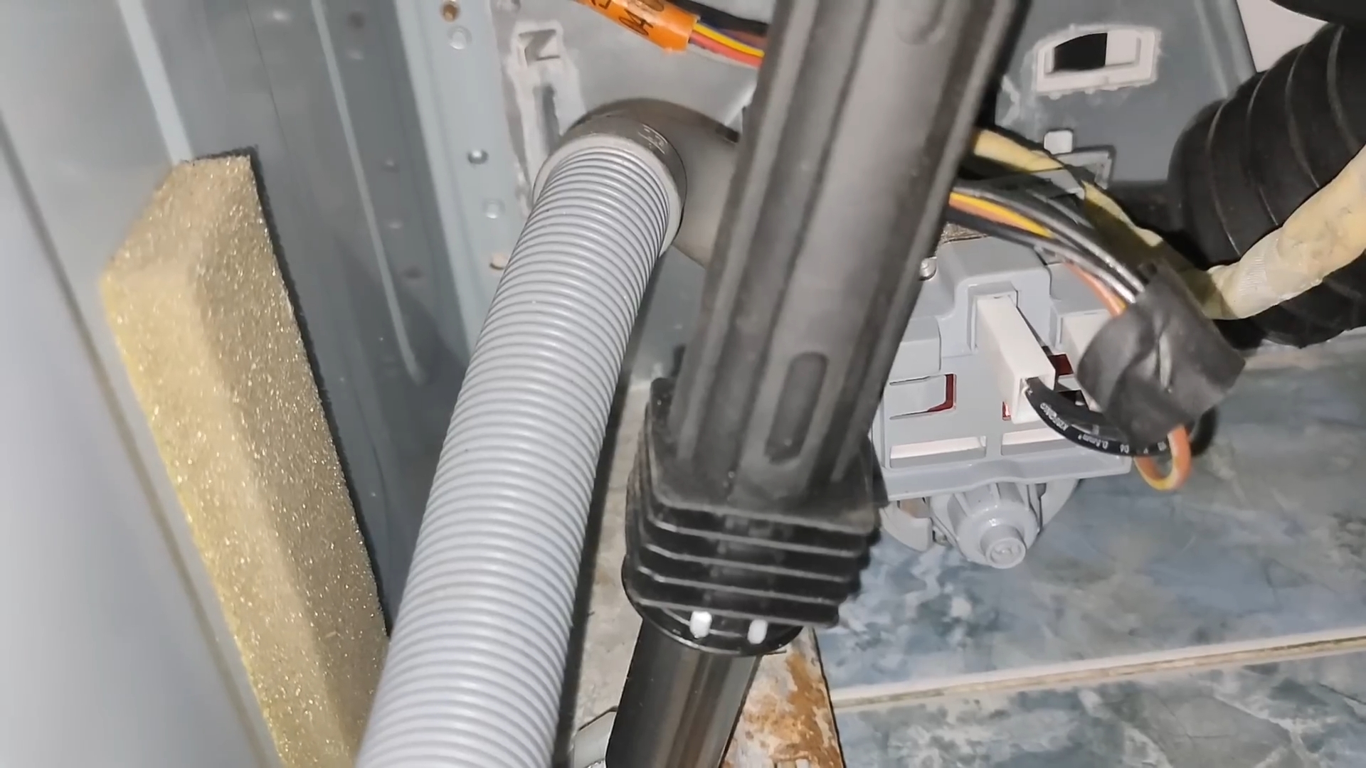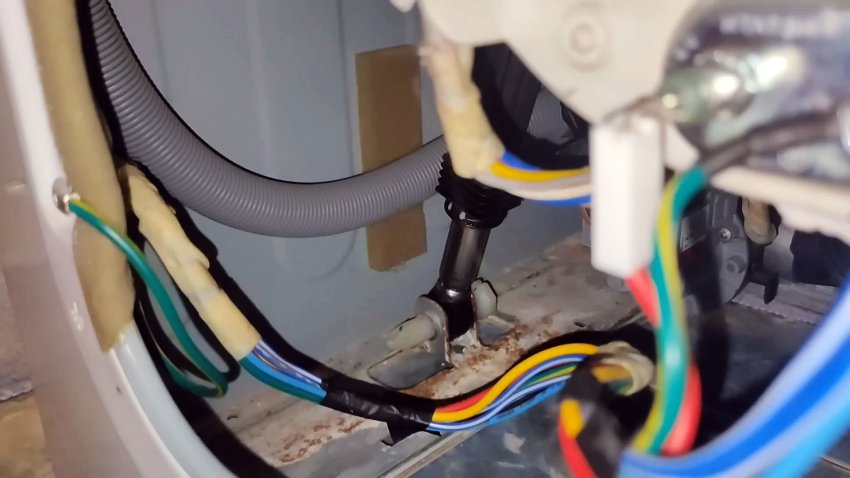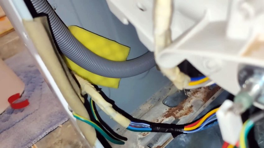 В чём причина стука? Сначала можно подумать, что стучит шланг датчика уровня воды — он иногда выскакивает из своего места. Но часто дело не в нём. Настоящая причина — сливной шланг задевает корпус машины во время отжима. Как это происходит: