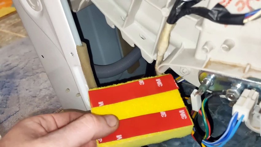 Возьмите губку и отрежьте кусочек такого размера, чтобы он закрыл место, где шланг бьётся о корпус (обычно это угол корпуса). Приклейте двухсторонний скотч к одной стороне губки.